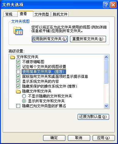 2、“查看”→去掉“使用簡單文件共享 (推薦)”前的勾