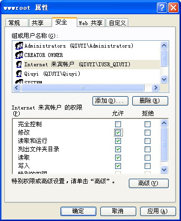 此時“組或用戶名稱”里有了“Internet 來賓帳戶 (QIUYI\IUSR_QIUYI)”,紅色部分為你的計算機名稱。選中“Internet 來賓帳戶 (QIUYI\IUSR_QIUYI)”,在下面的權(quán)限設(shè)置里的“允許”項選中“修改”,“確定”完成。